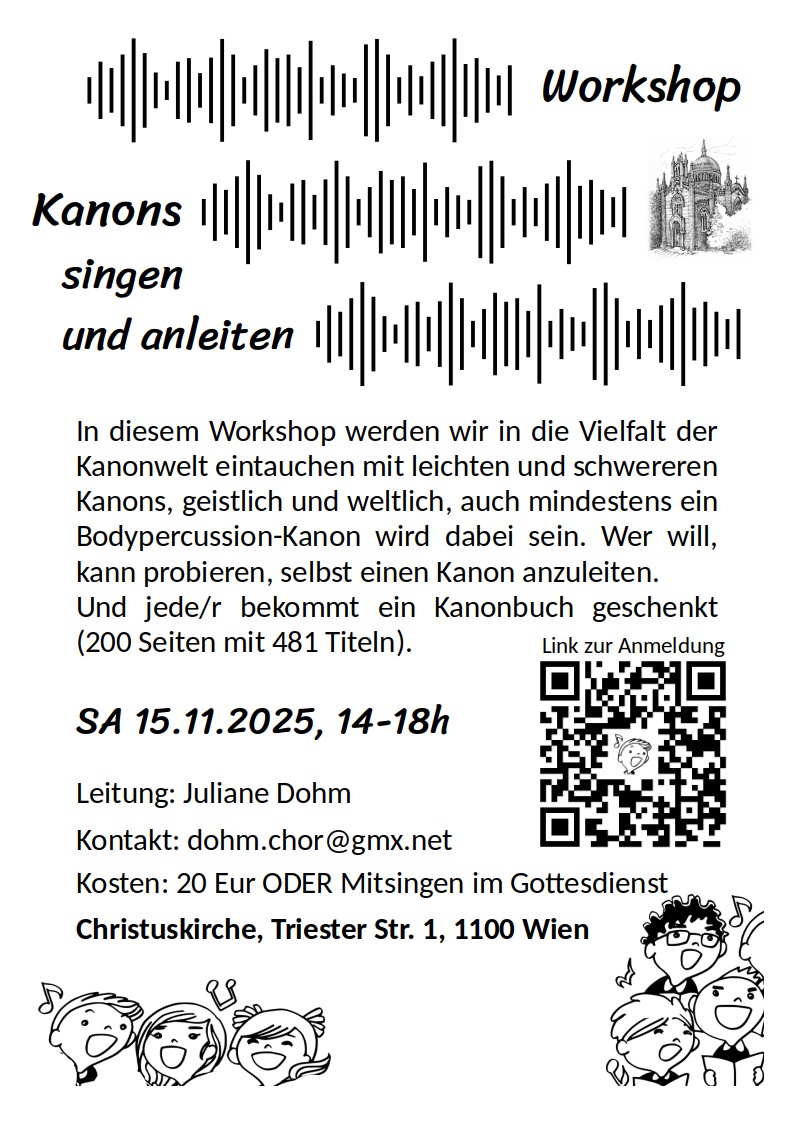 In diesem Workshop werden wir in die Vielfalt der Kanonwelt eintauchen mit leichten und schwereren Kanons, geistlich und weltlich, auch mindestens ein Bodypercussion-Kanon wird dabei sein. Wer will, kann probieren, selbst einen Kanon anzuleiten. Und jede/r bekommt ein Kanonbuch geschenkt (200 Seiten mit 481 Titeln).